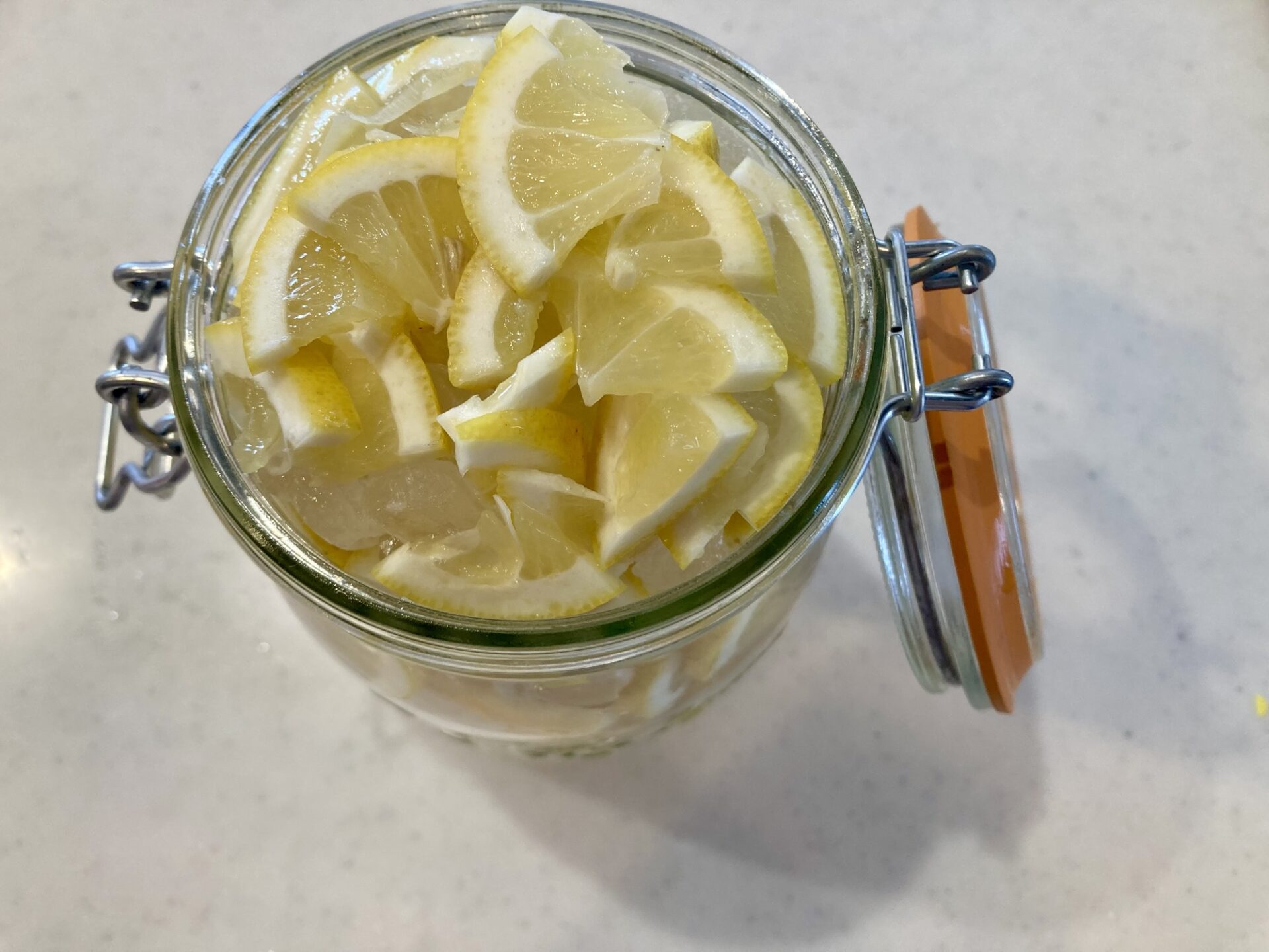 - レモンを適当に切ろう:私はレモン2個分を輪切りに、残りは小さく切りました。いくつか輪切りを瓶の周りに沿わせて入れれば、瓶に入れた時に非常に映えます。写真は詰めた後ですが、切り方がわかりやすいように。